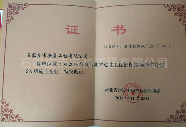 2016年度河北省建設(shè)工程招標(biāo)投標(biāo)誠(chéng)實(shí)守信5A級(jí)施工企業(yè)